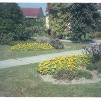 - Successful use of Gazania krebsiana (original text "krebzii") as a border plant. To its right a Felicia echinata in full flower. In background between post-box and cottage is a Polygala in full flower.