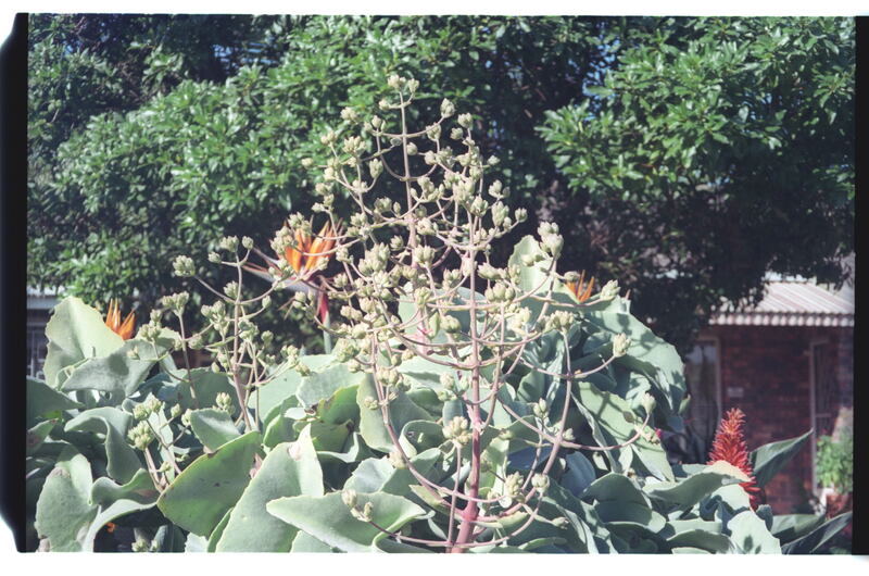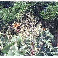 - Kalanchoe beharensis (alien) coming into bud for first time after 16 years since planting. Flowers opened later but were insignificant for photographing.