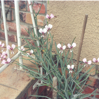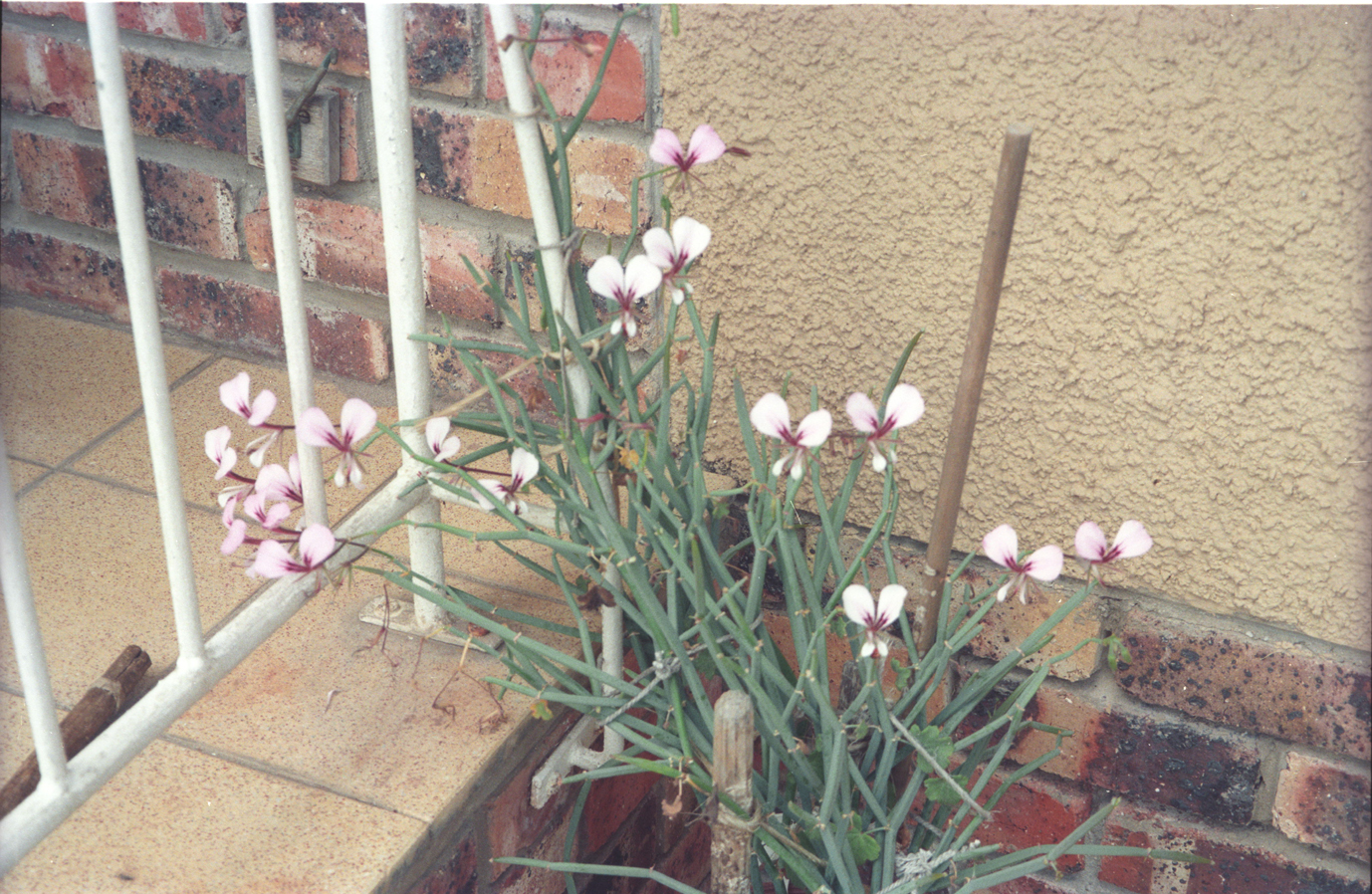- Pelargonium tetragonum in pot with 18 blooms. Grown from slip taken at Redhouse. Origional flower illustrated by Helen Vanderplank.