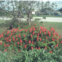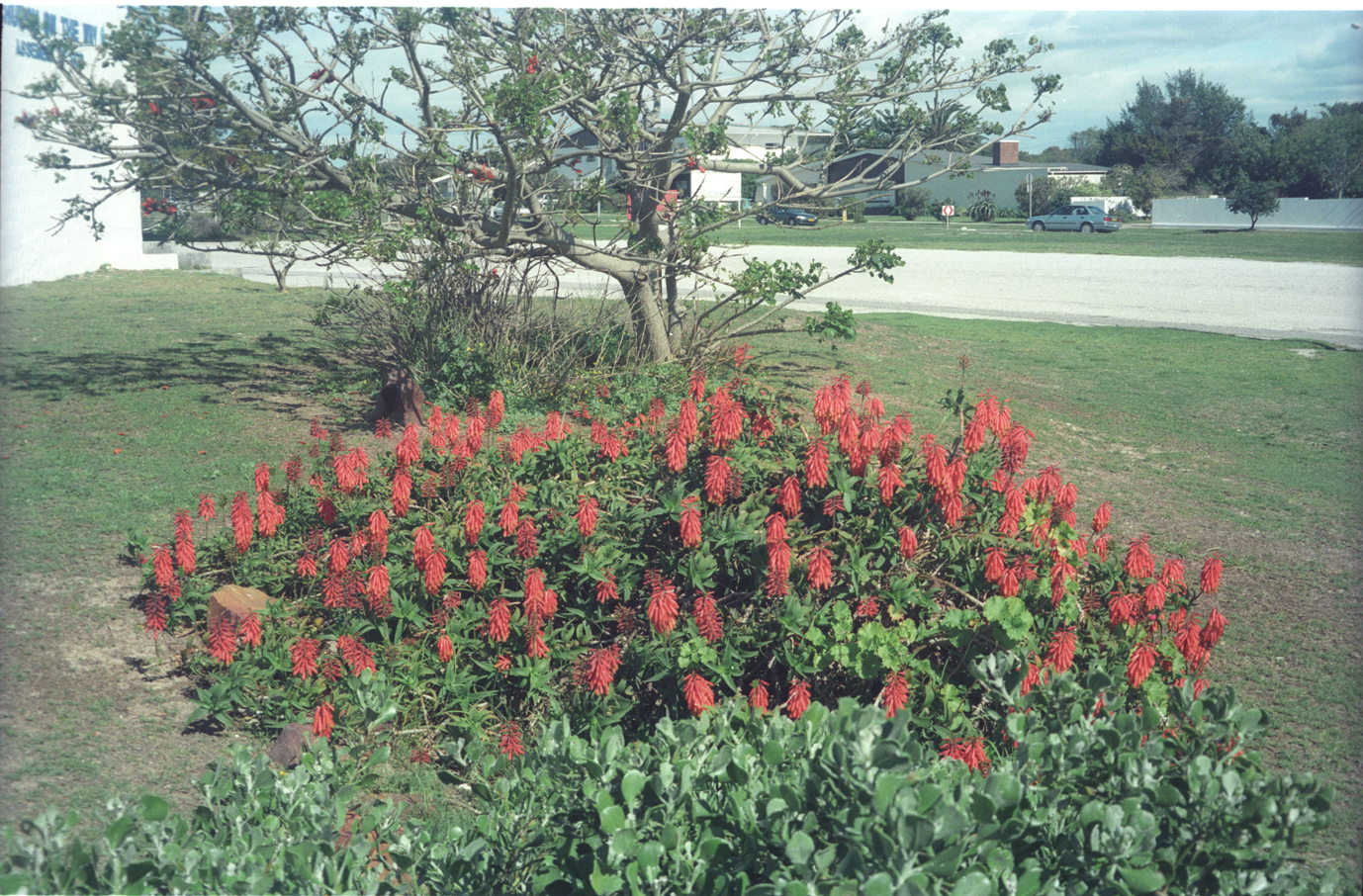 - Exceptionally good flowering of an aloe patch, probably Aloe ciliaris or the like. In this case the plant was allowed to creep over other bushes. Destroyed in 1999.