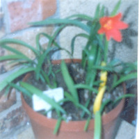 - Cyrtanthus sanguineus in pot at C.J. Skead's cottage. Second season of flowering. Four bulbs flowered this year, about same in 1998. This was last. Many new bulbs emerging. Originals from fine display at Miss HJ Vanderplank's potted specimens at Kruger Gardens, Summerstrand, Port Elizabeth (her originals from Grahamstown). This shows how well the plant does in pots and gardens.