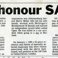 - Photocopied article which announces a concert tributed to Chris McGregor and all the members of Brotherhood of Breath, who died at the 100 Club, London.