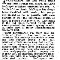 - Photocopied article about a concert by Chris McGregor's band at the Old Place, Gerrard Street, England.