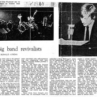 - Photocopied article about the revival of big bands after rock 'n' roll was born. There are 2 pictures with this article. The left picture shows Mike Westbrook's Concert Band on stage and the right picture is a portrait of Mike Westbrook playing piano.