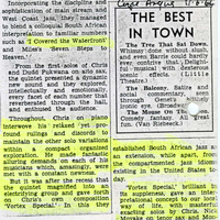 - Photocopied article from the South African newspaper Cape Argus about a concert at Weizmann Hall, Cape Town, by Chris McGregor's Blue Notes. The band has established itself "among the best jazz giants at a stimulating and innovating jazz concert".