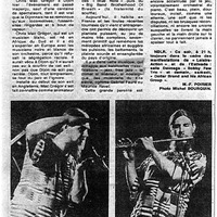 - Photocopied article from the French newspaper Les Dépêches about a concert by Chris McGregor at the music festival Estivade de Dijon. There are 3 pictures with this article. The picture on the top left shows Chris McGregor clapping his hands while the right picture shows him playing flute. The bottom picture captures the audience during the concert.