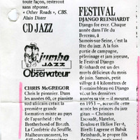 - Photocopied article from the French newspaper Le Nouvel Observateur about a concert in Angoulême (France) of Chris McGregor's Brotherhood of Breath with Johnny Clegg. There is also a picture of Chris McGregor with this article.