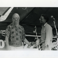 - Black and white photo (front and back) of Chris McGregor shaking hands with Victor Ntoni.