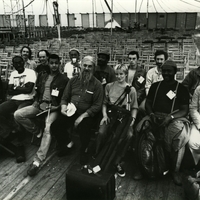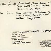 - Black and white photo (front and back) of the music band Brotherhood of Breath on concert seats in Montpellier (France) in 1988. Back row: Robert Juritz, Dave DeFries, Claude Deppa, Ernest Mothle, Julian Arguelles, Chris Biscoe and Fayyaz Virgi. Front row: Steve Williamson, Jeff Gordon, Thomas Dyani, Chris McGregor, Annie Whitehead, Gilbert Matthews, Harry Beckett. There are 2 stickers at the back of the photo. The sticker on the left indicates the name and the postal address (in Belgium) of the photographer and the date of the Copyright of the photo (1989) and the sticker on the right indicates Chris McGregor's postal address in France.