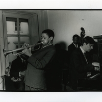 - Black and white photo of Chris McGregor playing the piano (on the right) and Mongezi Feza playing Trumpet (of the left) with other musicians at the back: behind Mongezi Feza, a saxophonist (probably Dudu Pukwana) and behind Chris McGregor, a double bassist (probably Johnny Dyani).