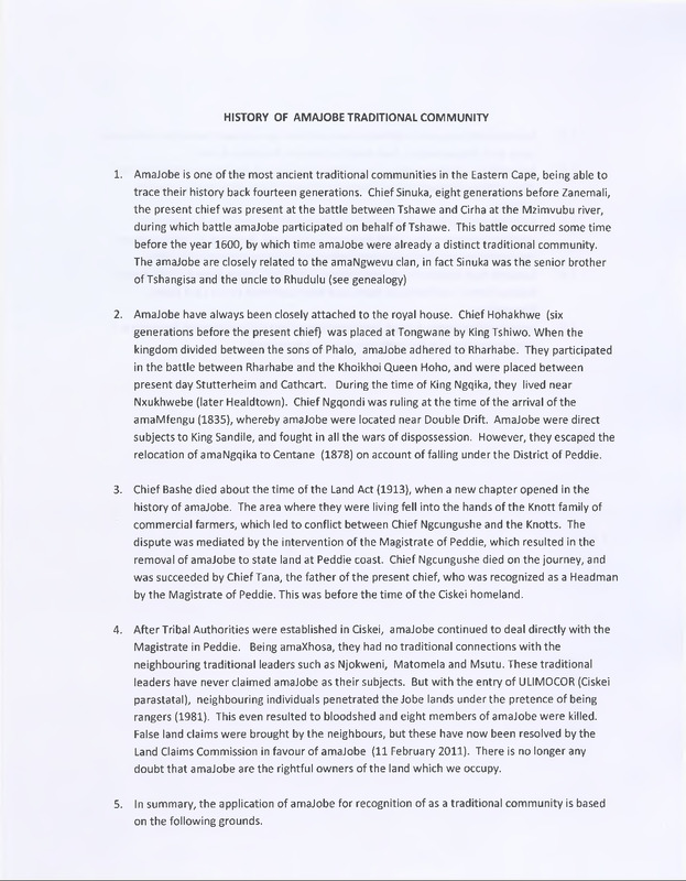 - Historic record of AmaJobe community drafted by Chief Zanemali Bani. AmaJobe is one of the most ancient traditional communities in the Eastern Cape, tracing its history back fourteen generations. Chief Sinuka, eight generations before Zanemali, the present chief was present at the battle between Tshawe and Cirha at the Mzimvubu river, during which battle amaJobe participated on behalf of Tshawe. This battle occurred some time before the year 1600, by which time amaJobe were already a distinct traditional community. The amaJobe are closely related to the amaNgwevu clan; in fact, Sinuka was the senior brother of Tshangisa and the uncle to Rhudulu.
