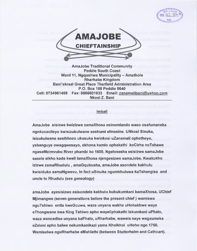 - Historic record of AmaJobe community drafted by Chief Zanemali Bani. AmaJobe is one of the most ancient traditional communities in the Eastern Cape, tracing its history back fourteen generations. Chief Sinuka, eight generations before Zanemali, the present chief was present at the battle between Tshawe and Cirha at the Mzimvubu river, during which battle amaJobe participated on behalf of Tshawe. This battle occurred some time before the year 1600, by which time amaJobe were already a distinct traditional community. The amaJobe are closely related to the amaNgwevu clan; in fact, Sinuka was the senior brother of Tshangisa and the uncle to Rhudulu.