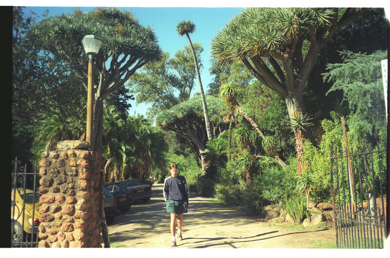 - Rhodes University student passing through northern gates of the Botanical Gardens. Note the variety of interesting plants including aliens.