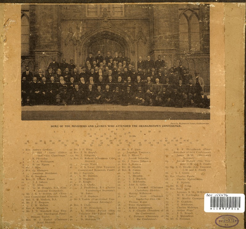 Hepburn & Jeanes, “Group photograph : members of the twenty-third annual Conference of the Methodist Church of Southern Africa, held in Grahamstown, 1905”, Cory Library and Historical Archives, accessed 28 December 2025, https://digitalarchives.ru.ac.za/s/cory/item/4480
