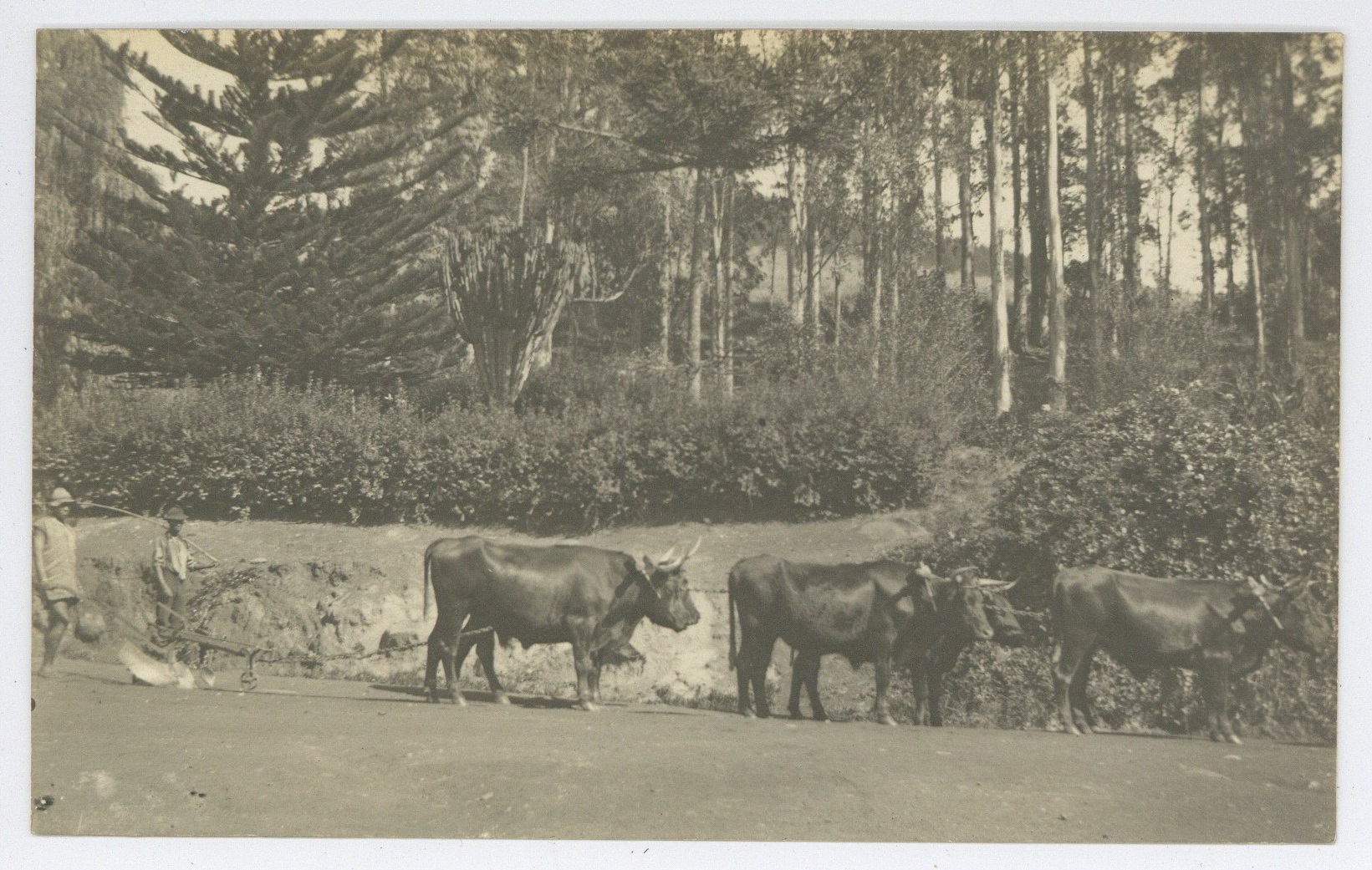 Photo of cattle pulling a plough along a road, with two labourers