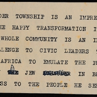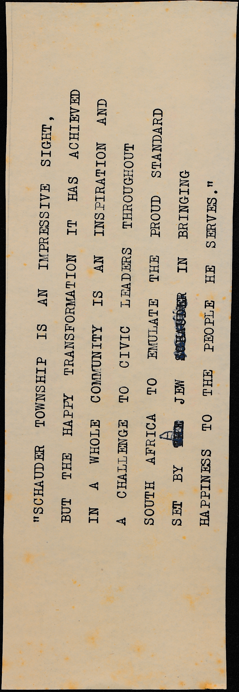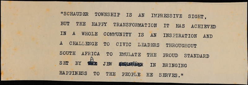 - Transcript: "Schauder Township is an impressive sight, but the happy transformation it has achieved in a whole community is an inspiration and a challenge to civic leaders throughout South Africa to emulate the proud standard set by a Jew in bringing happiness to the people he serves."