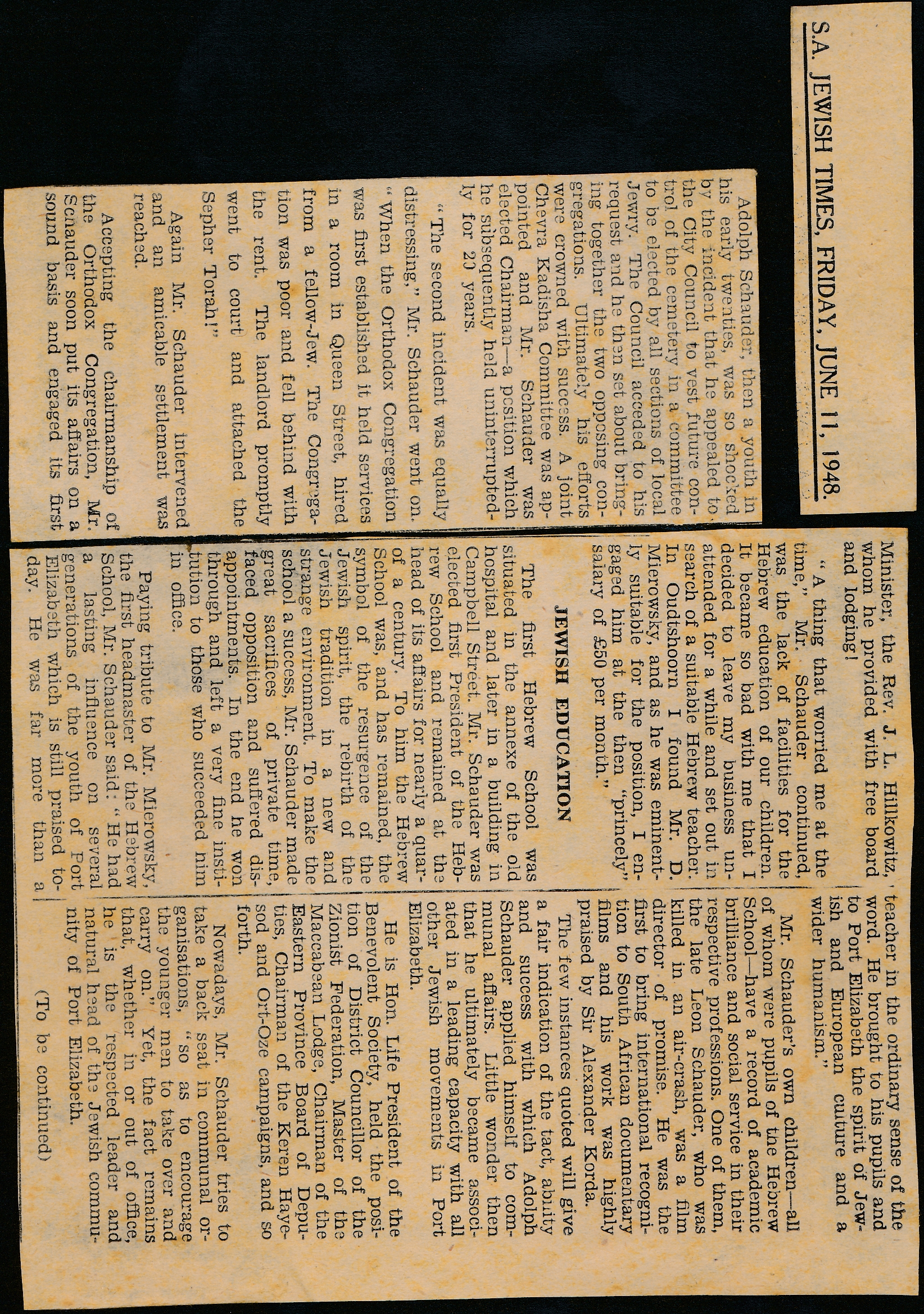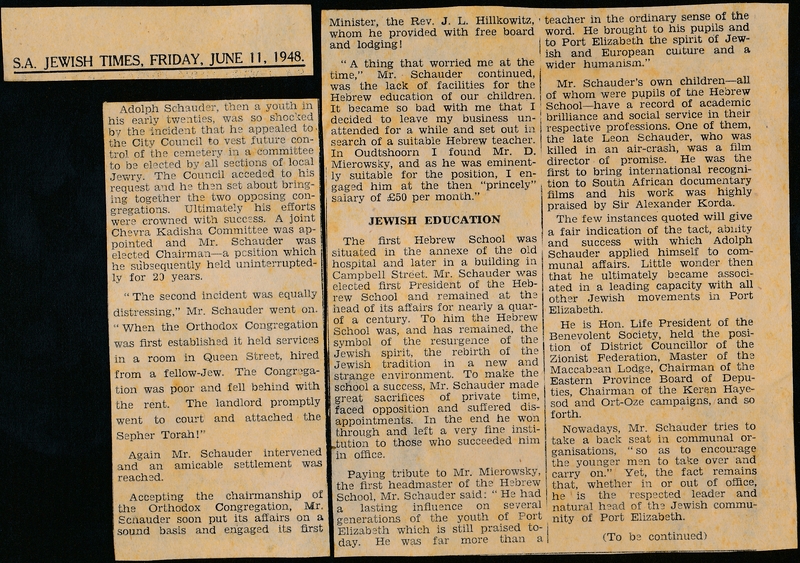 - Article snippet about Adolph Schauder - S.A. Jewish Times, Friday, june 11, 1948.