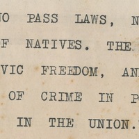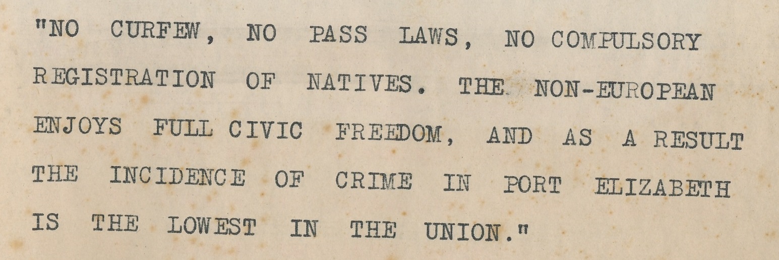 - Caption reads: "No curfew, no pass laws, no compalsory registration of natives. The non-European enjoys full civic freedom, and as a result the incidence of crime in Port elizabeth is the lowest in the union."