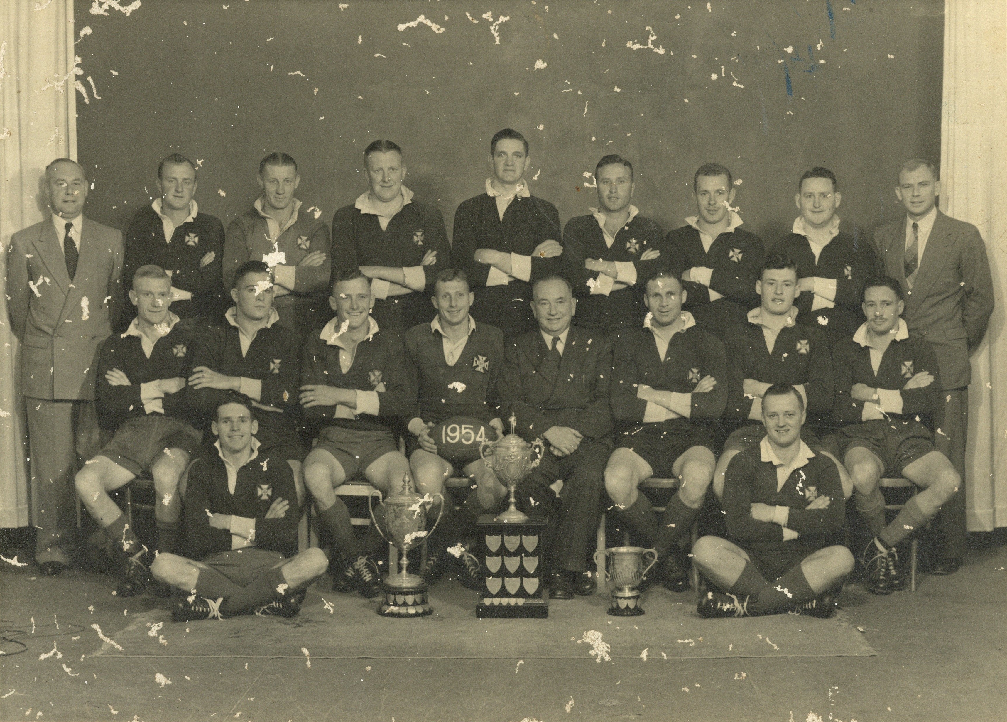 - Albany Rugby Football Club 1st XV 1954,. 1st XV – 1954, Winners Birch Cup, Michau Cup and E.P. Grand Challenge, trophy cups in front, Team photograph with rugby/football players in rugby uniform, Players have arms crossed, Group photograph, Black and white photograph, Indoor photograph, Two men standing on sides and President, sitting, wearing suits, Captain holding rugby ball with “1954” on it, Back Row (left to right): L. B. Green, J. Mullins, G. Bezuidenhout, R. Howard, F. Potgieter, K. Watson, R. Nieuwenhuizen, D. Harty, P. Frayne, Sitting (left to right): R. Futter, N. Webb, D. Richardson, T. W. Mills (Captain), J. A. W. de Jager (President), T. C. Mills, (Vice-Captain), R. Mogg, D. van Niekerk, In Front: R. Wise, L. Emms.