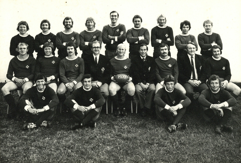 - Albany Rugby Football Club 1977. Team photograph with rugby/football players in rugby uniform, Group photograph, Black and white photograph, Outdoor photograph, Players standing at back have arms crossed, Players sitting have hands in lap while players sitting on the grass have arms around legs, Club captain, president and coach wearing suits, Captain holding rugby ball with “1977” on it., Back Row (left to right): C. Pascoe, C. Strydom, D. Wicks, S. Long, C.Morrell, A. Wakeford, M. Taylor, L. Coetzee, H. Edge, Middle Row (left to right): G. Samuel, R. Smuts, J. Scott, F. Maritz (Club Captain), S. Hill (Captain), L. Tilney (President), C. Jones (Coach), K. Miskin, Front Row (left to right): R. Snow, K. Coetzee, F. Coetzee, D. Coetzee, Absent: R. Austin, E. Classen, B. Carlson.