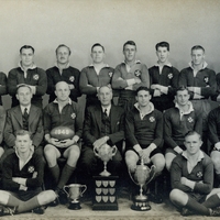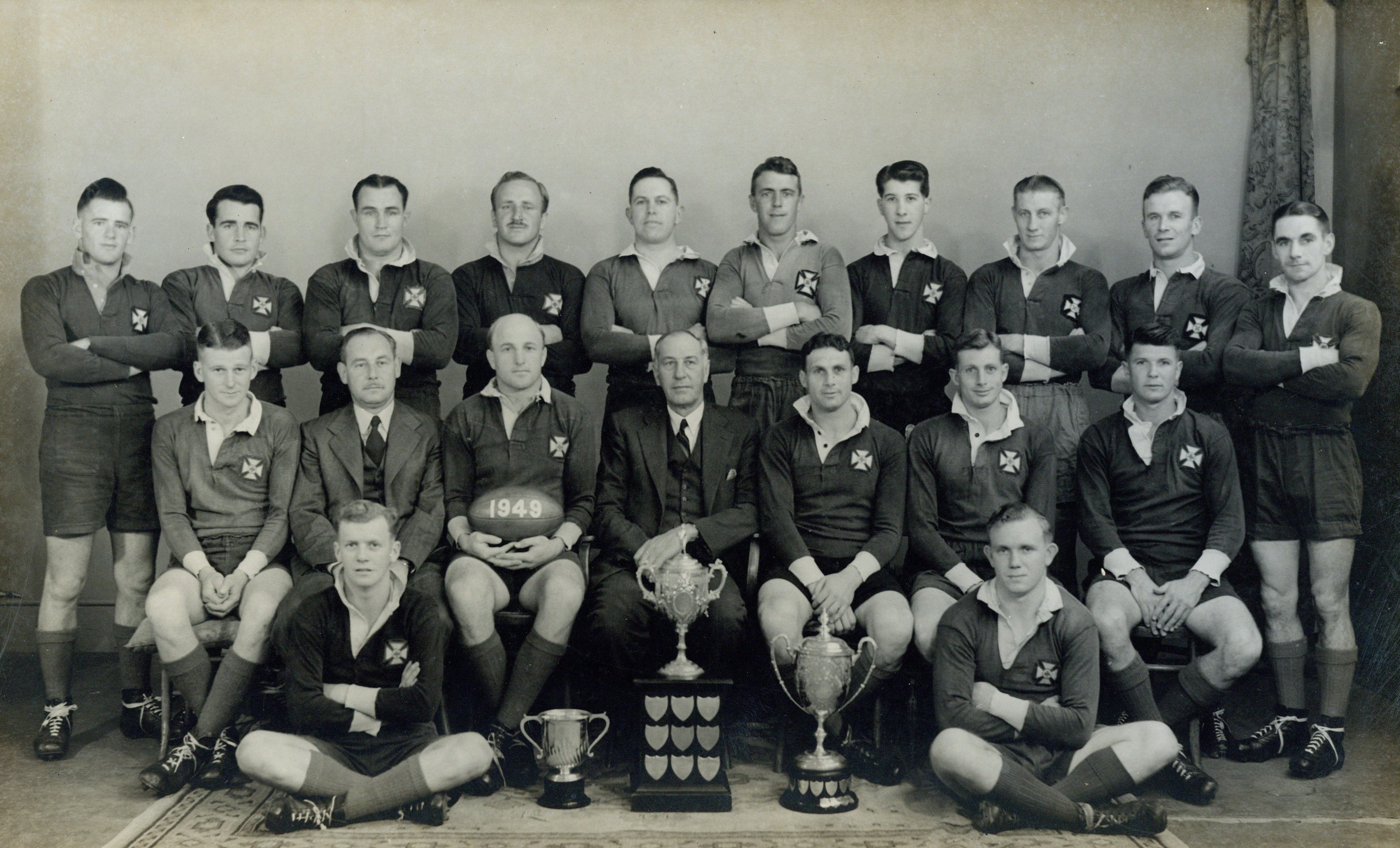 - Albany Rugby Football Club 1949. Winners of the “E.P. Grand Challenge” and “Michau Cup”, trophy cups in front, Joint holders of “Pauletta Cup” and “Birch Cup”, Team photograph with rugby/football players, in rugby uniform, Group photograph, Black and white photograph, Indoor photograph, Players standing and sitting on the floor have arms crossed, Players sitting have arms in lap, President wearing a suit, Captain holding rugby ball with “1949” on it, Back Row: C. Lombard, M. Basson, K.Pike, H. Bowker, H. Schooling, D. Ford, L. Colyvas, G. Bezuidenhout, C. Heunis. A. Tomlinson, Middle Row: D. Nash, L. B. Green (Secretary), E. Norton (Captain), Mr. A. F. Liliford (President), T. Mills (Vice-Captain), W. Mills, R. Crebo, Front Row: P. Stirk, G. Reed.
