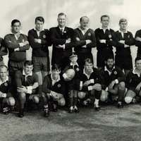 - Albany Rugby Football Club 1st XV 1964. Team photograph with rugby/football players, in rugby uniform, Group photograph, Indoor photograph,Black and white photograph.Secretary and President wearing suits, Player standing have arms crossed, Players sitting have hands in lap, Back row (left to right): L. Mallett, D. Blomfield, C. Brown, D. Albertyn, N. Webb, M. Loots, Sitting (left to right): E. Kent, R. R. Nieuwenhuizen (Secretary), P. du Preez (captain), Dr. C. J. A. Dreyer (President), C. Howie (vice-captain), W. Fourie, J van Rensburg, Front sitting (left to right): D Pitt, N. Dugmore, D. Handley, N. Steffens, Absent: J. Strydom, T. C. Mills (Coach).