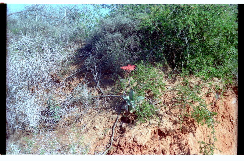 - Example of survival under severe and unnatural circumstances. A Coral Aloe, Aloe striata perilously perched on the vertical slope of a donga. A few others of its kind were growing nearby in more favourable situations.