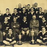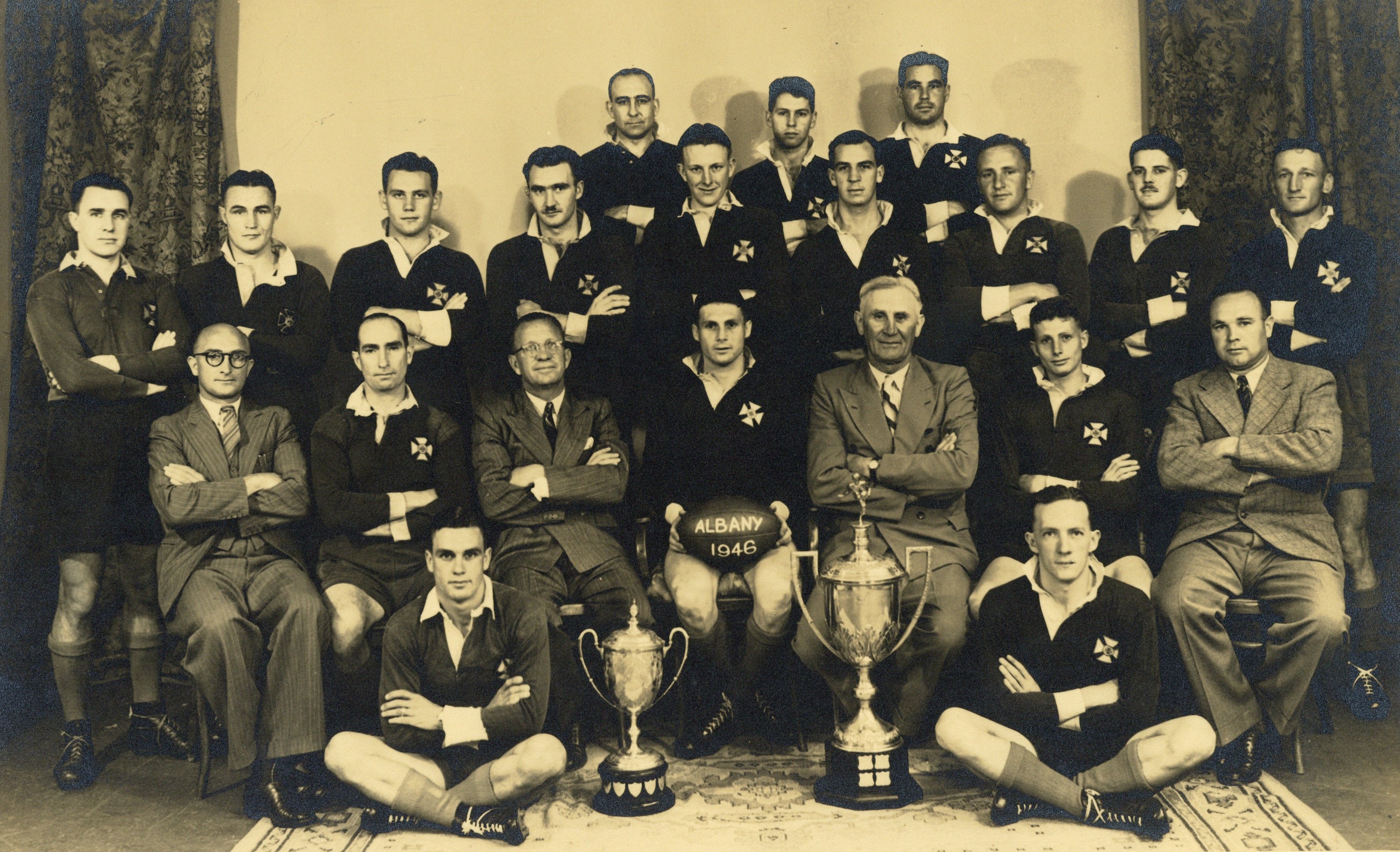- Albany Rugby Football Club 1st XV 1946. Team photograph with rugby/football players, in rugby uniform, Players have arms crossed, Group photograph, Black and white photograph, Indoor photograph, Winners of the Michau Cup and Pauletta Cup, trophy cup in front, J Norton, Colin Keey, President and Secretary wearing suits, Captain holding rugby ball with “Albany 1946” on it, Back Row: J. van der Walt, A. Meaker, M. Parry, Standing: J. du Plessis, M. Pike, J. Strauss, L. Smit, R. Howard, A. Lilford, H. Bowker, T. Hounsell, C. Penny, Sitting: J. Norton, W. Swart, Colin Keey, T. Mills (Captain), T. van Vuuren (President), B. Mills, Paddy Dale (Secretary), In Front: R. Reed, D. Seaman.