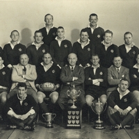 - Albany Rugby Football Club 1st XV 1958. Winners – E.P. Grand Challenge Cup, Michau Cup and Birch Cup, trophy cups in front, Team photograph with rugby/football players, in rugby uniform, Players have arms crossed, Group photograph, Black and white photograph, Indoor photograph, Vice- President, President and Secretary wearing suits, Captain holding rugby ball with “1958” on it, Players standing have arms by side, Players sitting have arms crossed, Players sitting on floor have arms in lap, Back row (left to right): A. White, A. Leach, Standing (left to right): P. Le Roux, H. Le Roux, W.E.A. Keey, B. van Heerden, J. Van Rensburg, N. Green, R. Nieuwenhuizen, J. Breytenbach, Sitting (left to right): R. Wise, C. J. Dale (Vice-President), T. C. Mills (Captain), L. B. Green (President), T. W. Mills (Vice Captain), R. Rawlinks (Secretary), L. Emms.
