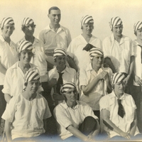 - Grahamstown Ladies Hockey Club on Tour 1923, On tour – 1923, Team photograph with hockey players wearing dark skirts and white shirts, striped caps on their heads, Group photograph, Black and white photograph, Outdoor photograph, Standing hockey players holding hockey sticks, Back Row: J. Milroy, I. Keey, Mr. Sherman, D. Wallace, P. Greenway, D. Wallace, Middle Row: J. Brook, E. Wallace, M. Style, Front Row: L. Milroy, K. Wetr (Captain), D. Keey.