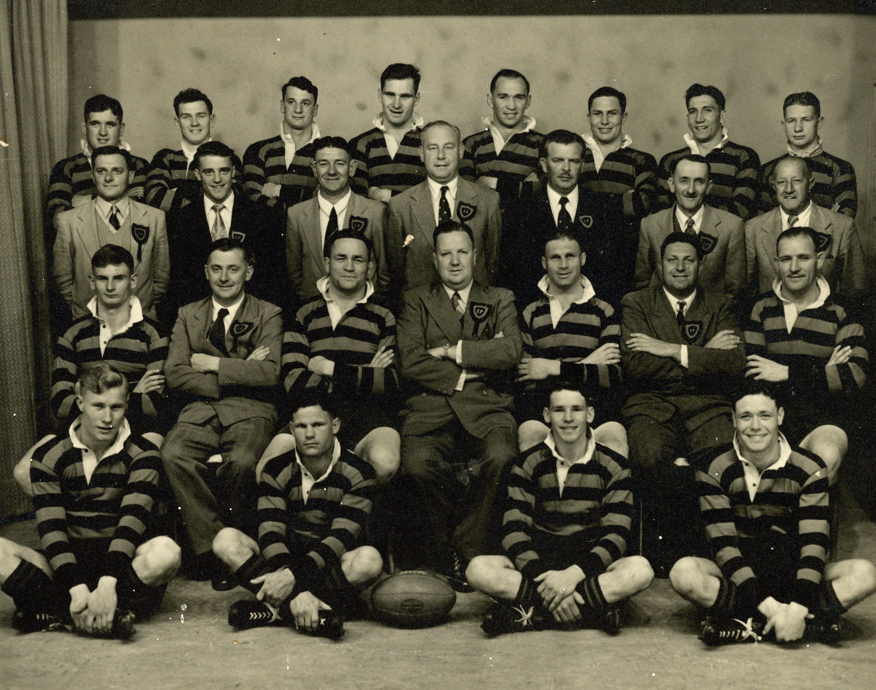 - Oostelike Provinsie Toerspan 1954, Photograph by the Volksblad, Bloemfontein, Team photograph with rugby/football players, in uniform, Group photograph, Black and white photograph, Indoor photograph, Players have arms crossed, some have their hands in their laps, while others have their hands behind their backs, Third row (3rde ry) all wearing suits, while three other men in second row (2de ry) also wearing suits, Rugby ball lying in front row, Agter (links na regs): K. Holton, W, Griffiths, D. Bouwer, D. Staples, R. Griesel, C. Kroon, C. van Straaten, L. Barnardt, 3rde ry (links na regs): J. Heyns, S. P. Ferreira, S. Fourie, L. B. Green, H. Melville, F. Ferreira, W. Davlin, 2de ry (links na regs): L. Raymond, C. Marx, A. du Plooy (Kaptein), L. Fourie (Bestuurder), T. Mills (Onder-Kaptein), H. Swart, D. Schonken, Voor (links na regs): S. Pearson, H, Burger, R. Wise, S. Visagie, Afwesig: F. Kingwell.