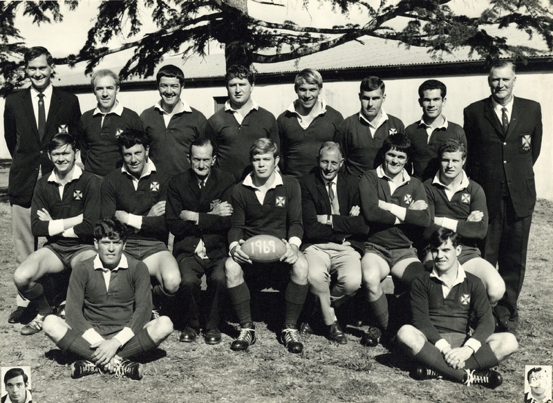 - Albany Rugby Football Club 1st XV 1969, 1st XV – 1969. Team photograph with rugby/football players, in rugby uniform, Group photograph, Black and white photograph, Outdoor photograph, Treasurer, Club Captain, President and Coach wearing suits, Captain holding rugby ball with “1969” on it, Players standing with arms by side, Players sitting with arms crossed, Players sitting on the grass with hands in lap, Team standing and sitting in front of tree and on grass, Building in the background, Back Row (left to right): J. Place (Treasurer), D. Phillipson, D. Pohl, B. O’Reilly, A. Read, W. Fourie, D. Klaasen, A. E. Timm (Club Captain), Middle Row (left to right): B. Green, E. Olivier, H. Blomfield (President), D. Emslie (Captain), B. Mills (Coach), B. Letcher, A. Le Roux, Sitting (left to right): L. Crous, C. Reed, Insets: C. Warren, M. Dunn.
