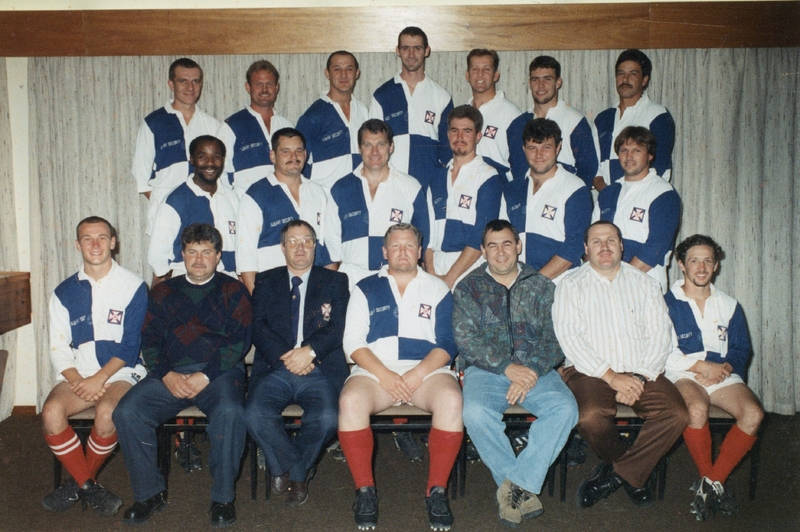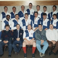 - Albany Rugby Voetbal Klub Eerste Span 1998, Eerste span – 1998, Team photograph with rugby/football players, in rugby uniform (blue and white checked jersey, white shorts, red socks), Group photograph, Colour photograph, Indoor photograph, Players standing have arms in front of themselves, by their sides or behind their back while those sitting have their hands in their laps, Agter (van links na regs): J. Lourens, S. Everton, W. Verwey, C. Kidson, M. Sweeny, D. Crous, R. van Vuuren, Middel (van links na regs): S. Thompson, H. Hayman, R. van Tonder, D. Brits, A. Annandale, T. Pretorius, Voor (van links na regs): S. Sawyer, H. Germishuys (Vise-President), G. Sawyer (President), P. du Preez (Kaptein), J. Vos (Afrigter), L. Germishuys (Addisionele Lid), R. Loots.