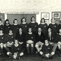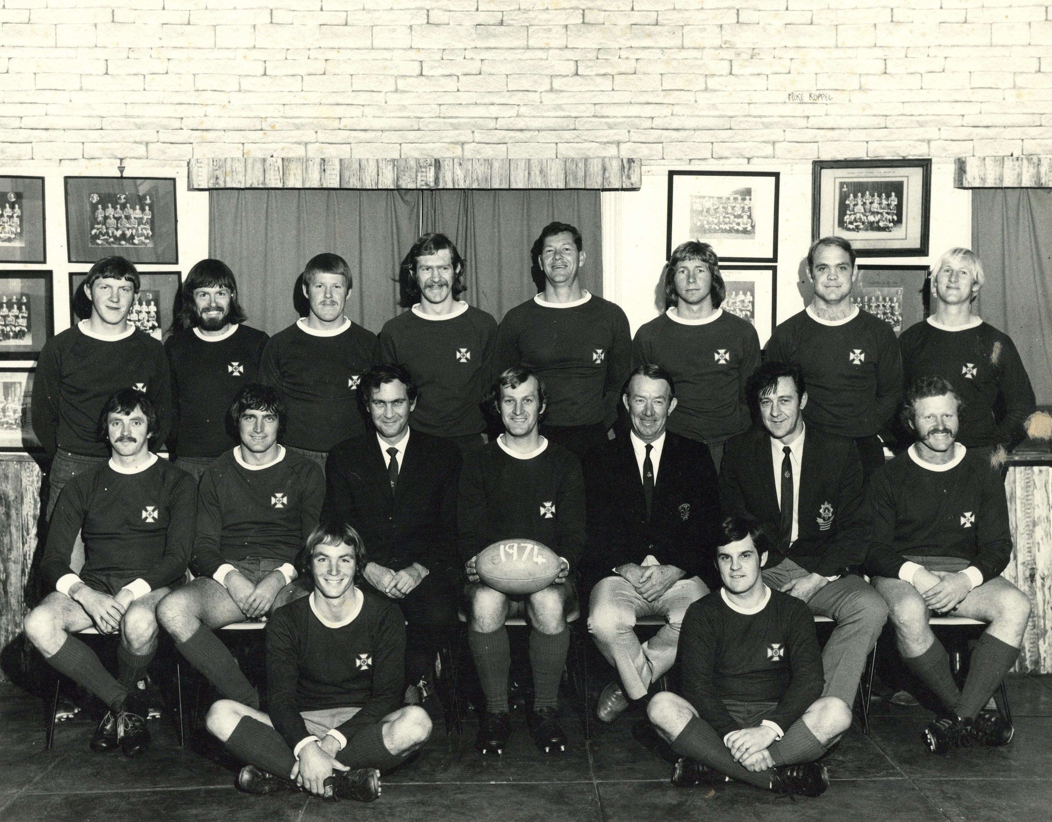 - Albany Rugby Football Club 1st XV 1974, Team photograph with rugby/football players, in rugby uniform, Group photograph, Black and white photograph, Indoor photograph, Framed photographs against wall in background, President, Club Captain and Coach wearing suits, Captain holding rugby ball with “1974” on it, Players standing have arms by side, Players sitting have hands in lap, Standing (left to right): A Marais, R. Snow, R. Green, B. Shone, P. van Rensburg, S. Long, D. J. Mills, S. Hill, Sitting: (left to right): L. Webster, R. Carlson, J. Place (President), B. Carlson (Captain), P. Long (Club-Captain), Major Bakkes (Coach), R. Moss, Front (left to right): A. Austin, C. Reed. Absent: C. Pascoe.