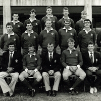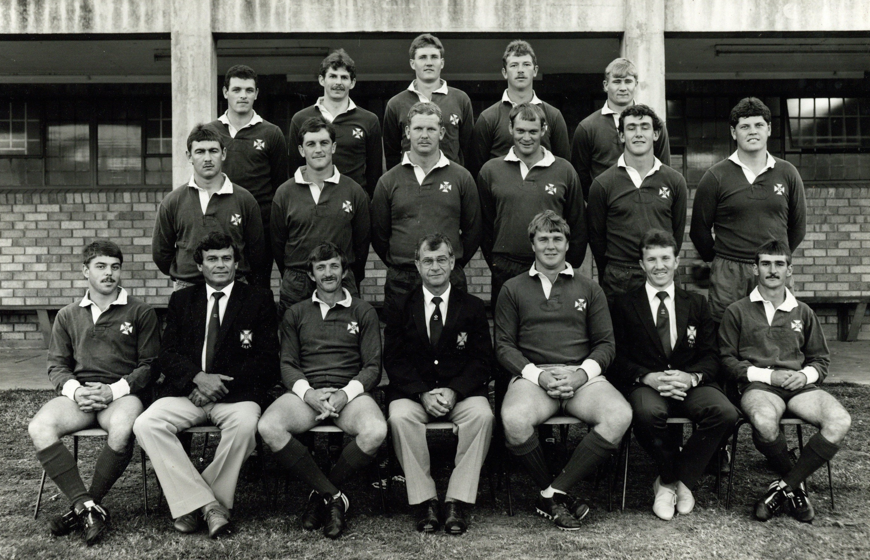 - Albany Rugby Football Club 1st XV 1988, Winners of the “Frans Geldenhuys Cup”, “Goodyear 7 a side” and “UCT Cup”, Team photograph with rugby/football players, in rugby uniform, Group photograph, Black and white photograph, Outdoor photograph, Vice President, President and Manager wearing suits, Players standing have arms behind their backs, Players sitting have arms in their laps, Back Row (left to right): M. Calitz, J. de Beer, J Waugh, L. Claasen, J. Spies, Middle Row (left to right): J. Vos, J. du Toit, N. Swart, D. Ferriara, P. Henderson, G. Maas, Front Row (left to right): B. Beneke, J. Moolman (Vice President), D. Meyer (Captain), R. Liddiard (President), W. Currie (Vice Captain), L. Wolmarans (Manager), J. Jacobs, Absent: B. Peterson (Coach), M. Koen.