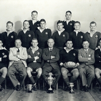 - Albany Rugby Football Club 2nd XV 1958, Second XV – 1958 Season, Winners – Midland Cup and Stirk Cup, trophy cups in front, Team photograph with rugby/football players, in rugby uniform, Group photograph, Black and white photograph, Indoor photograph, Captain holding rugby ball with “1958” on it, Vice-President and Secretary wearing suits, Players sitting have arms crossed, Players standing have arms by their sides or are holding their hands, Back Row: A. Huckle, G. Kemp, Standing: K. Beeton, N. Green, E. Rothman, J. van Wyk, E. Dyson, F. Heath, M. Rushmere, J. Breytenbach, Sitting: J. Venter, C. J. Dale (Vice-President), R. Futter, L. B. Green (President), C. J.Smit (Captain), R. Rawlinks (Secretary), C. Jones-Phillipson.