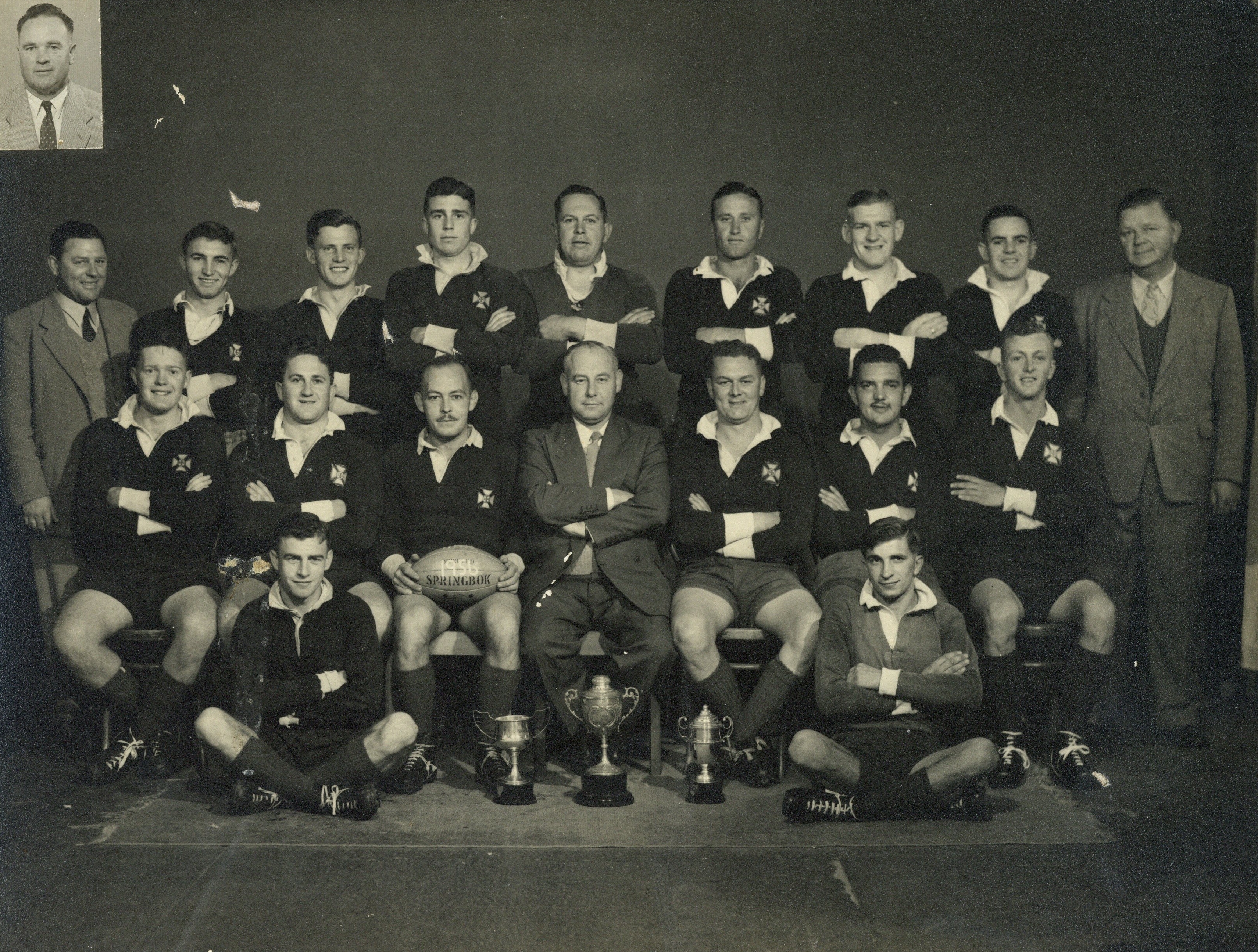 - Albany Rugby Football Club 3rd XV 1956, Winners of the Midlands Cup, Grahamstown Cup and Abbot Cup, trophy cups in front,Team photograph with rugby/football players, in rugby uniform, Group photograph, Black and white photograph, Indoor photograph, Players have arms crossed, Captain holding rugby ball with “1956” on it, Honourary Secretary, Coach and President wearing suits, Standing (left to right): R. Rawlinks (Honourary Secretar), L. Kritzinger, N. Louw, D. Law, H. Schooling, K. Watson, I. Futter, D. Wright, Sergeant Heath (Coach), Sitting (left to right): N. Green, S. van der Watt, D. Nieuwenhuizen (Captain), Mr. L. B. Green (President), J. Coetzer, C. Erasmus, D. Wallace, Front row (left to right): R. Liddiard, W. Steffens, Inset: P. Dale (Club Captain)