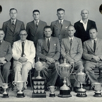 - Albany Rugby Football Club Trophies Won 1947, Group photograph of the Executive Committee, all wearing suits, Black and white photograph, Indoor photograph, Men standing have arms by their sides, Men sitting have arms in their laps, Row of trophy cups displayed in front of the Executive Committee, Standing: L. B. Green (Secretary), T. C. Mills (Captain), W. Steyn (Vice Captain), J. B. Norton (Treasurer), Sitting: H. L. Connock (Selector), C. Fortune, M. J. Ansley (President), S. J. Hunter, C. J. Dale (Selector), Insets: A. C. Keey (Club Captain), T. van Vuuren (Late President).