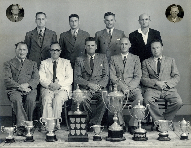 - Photo of Albany Rugby Football Club Team - 1910. 1st team 1910, Winners Eastern Province Grand Challenge Cup, Town Cup and Country Cup, Team photograph with rugby/football players, in rugby uniform, Group photograph, Indoor photograph, Black and white photograph Players have arms crossed, Two men sitting wearing suits, Two trophy cups in front with rugby ball with “1910” on it resting against one trophy cup, Standing: Dawson-Smith, Bessenger, White, V. Ford, Dold, H. Ford, Earp-Jones, Mallett. Middle row: Lawrance, Dennis, P. C. Demaine (captain), W. Stanton (secretary), Dawson, Versfeld. Front row: Bekker, C. Stocks.
