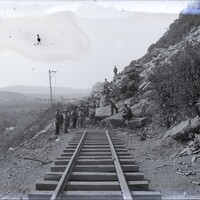 - Glass negative : View showing men working to clear a rockslide over a railway line
