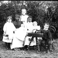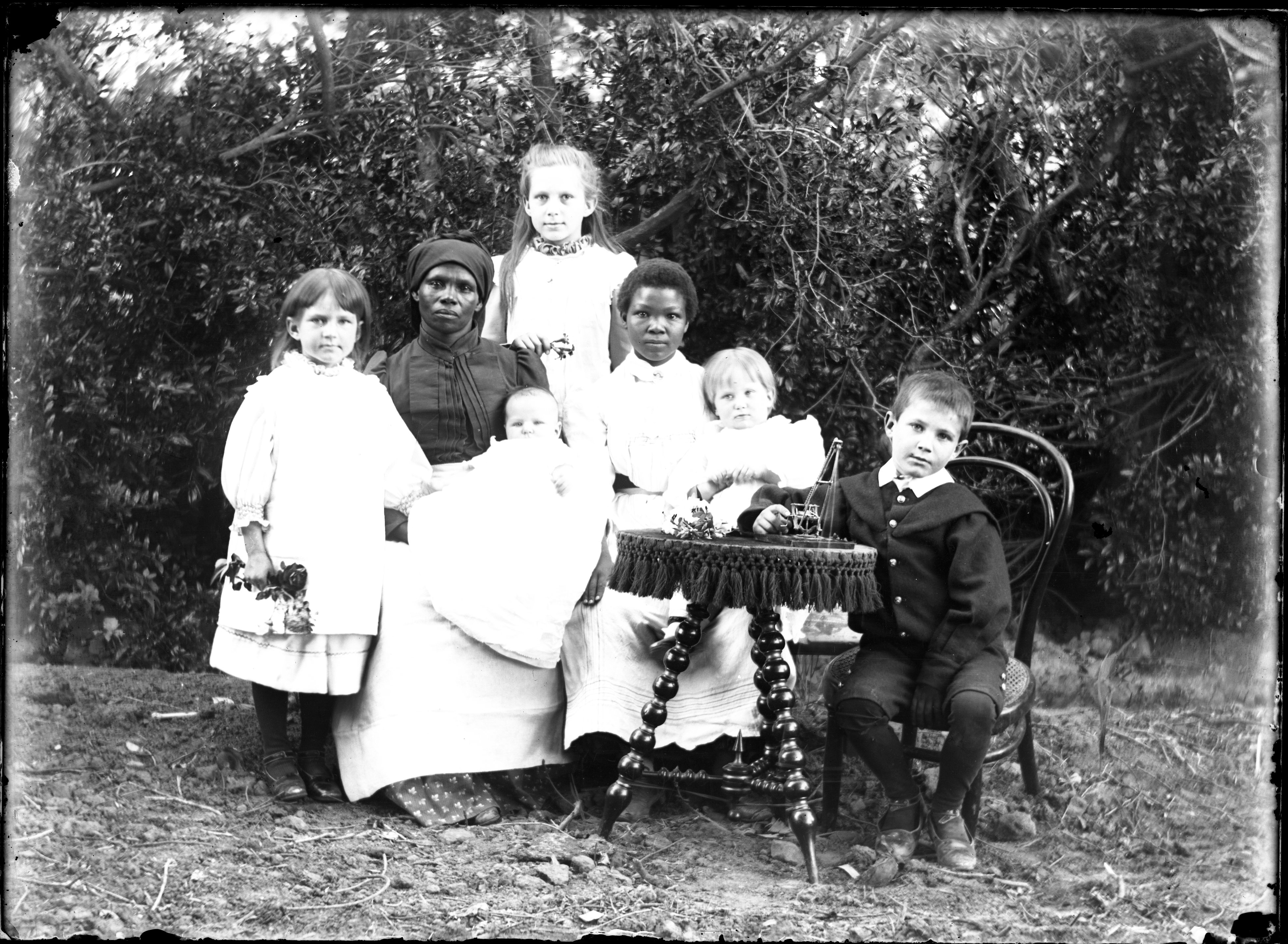 - Glass negative : Family portrait (names unknown) of two women, seated, with five children [ca. 1905]: two girls, a boy, an infant and a baby