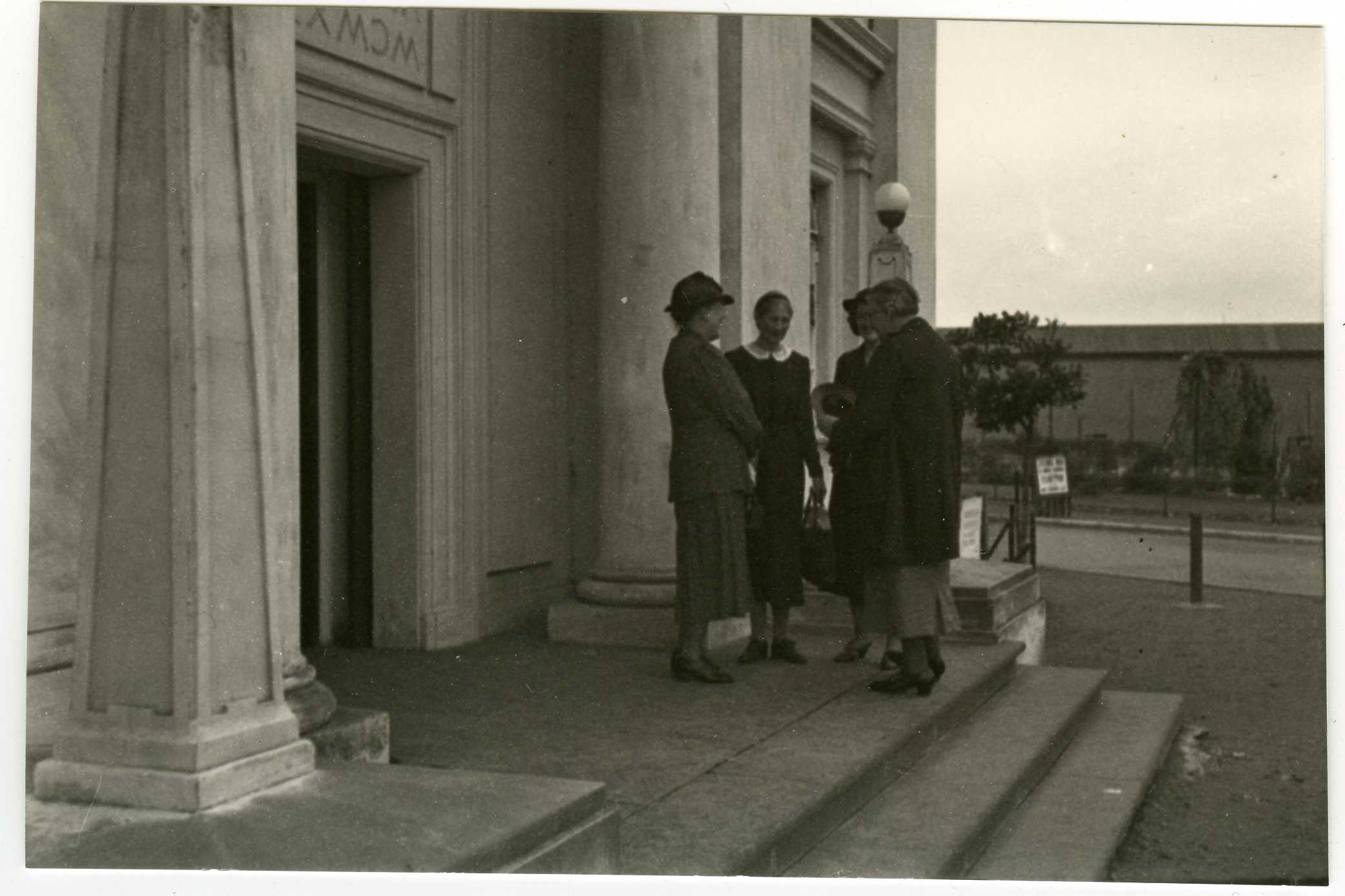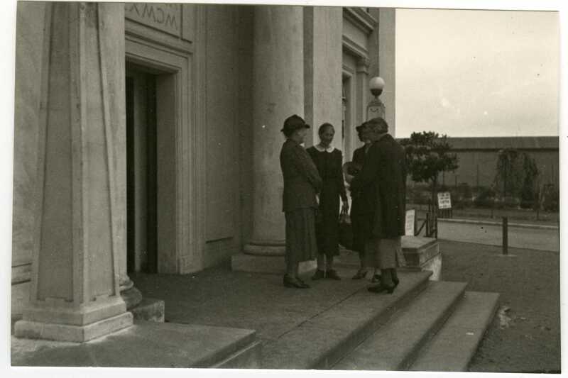 - Negatives : Five views showing unidentified people: a-b. people seated in a circle listening to a speaker; c. people talking on a verandah; d-e. smartly dressed people standing in front of a doorway with the inscription E.P.S.A. & C. Arts Hall MCMXXVII.