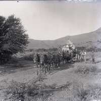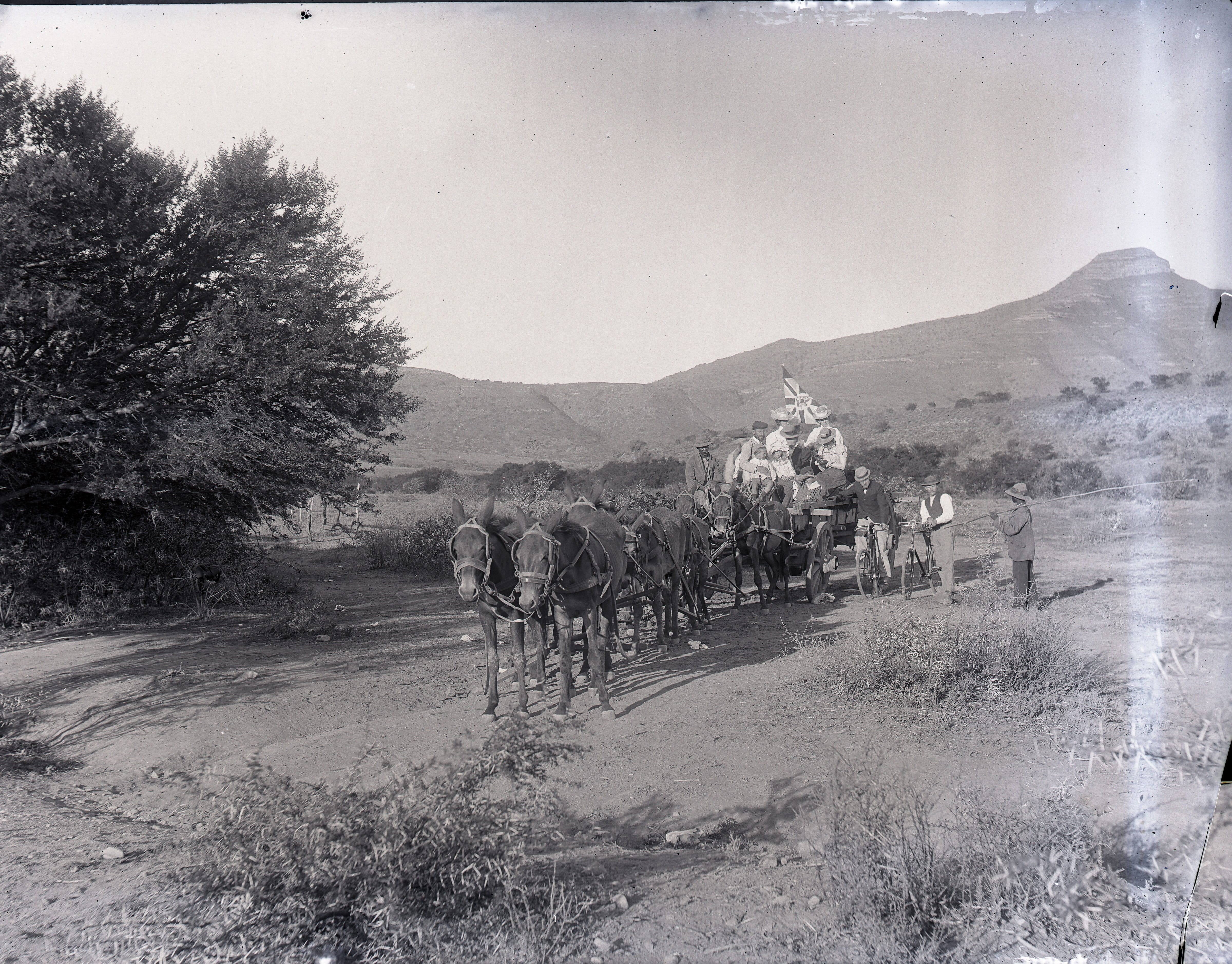 - Glass negative : View of a picnic at Elandsberg, New Year 1900, showing the picnic party seated in a cart pulled by a team of six mules, with two cyclists next to the cart. Lower right corner of the negative is broken. An incomplete piece accompanies the negative.