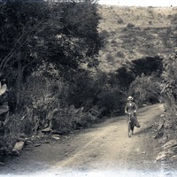 - Glass negative : View of a woman riding a bicycle on a farm road at "Paradise", near Cradock, Whitsun 1903.