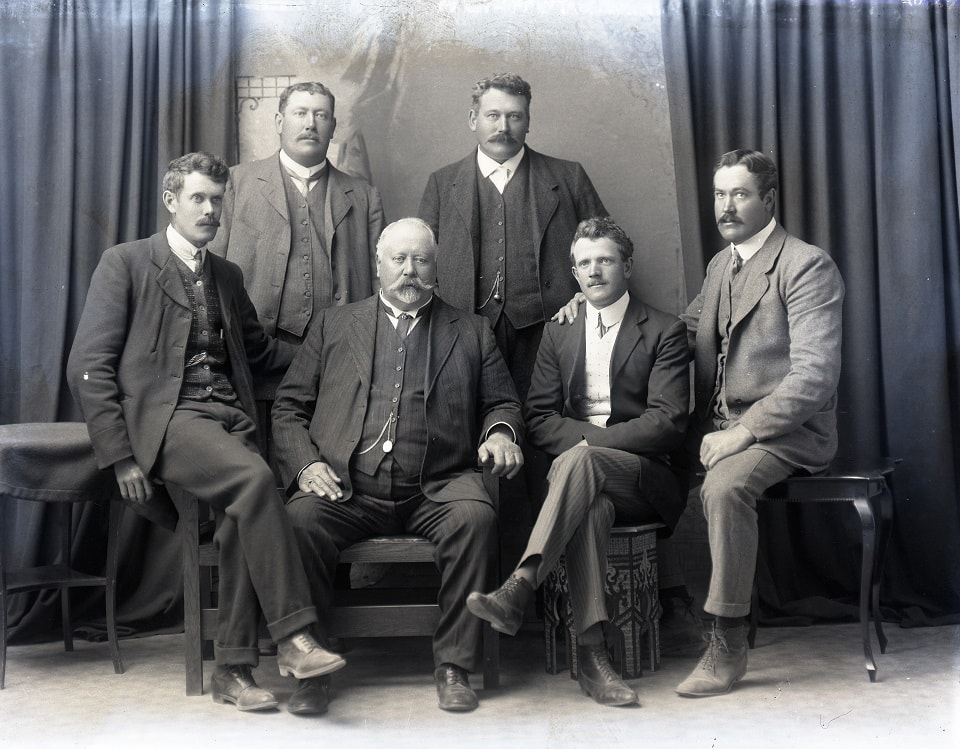 - Glass negative : Group portrait of four seated men, with two standing behind them, possibly the staff of Michau & Hofmeyr, Attorneys. The negative is marked 'P. W. Michau'. In 1905 there was a firm, Michau & Hofmeyr, Attorneys, in Cradock.