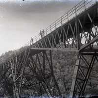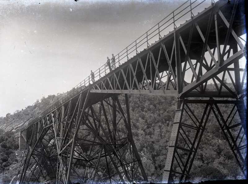 - Glass negative : View of Blaauwkrantz Bridge taken from below, showing three men looking over the railings into the gorge.