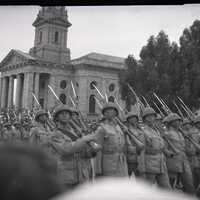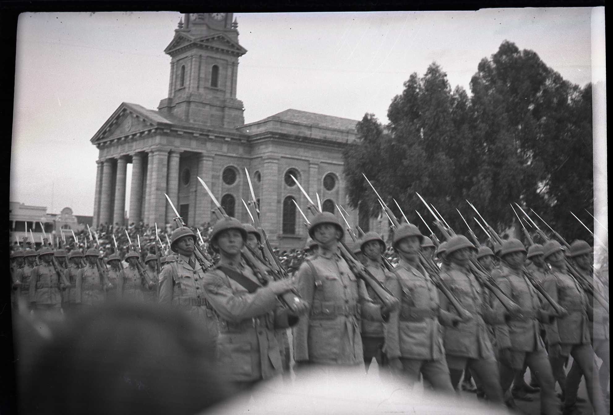 - Negatives : Fifteen views showing the Mobile Column at Cradock, with marching band, and troops lined up on Market Square next to the Dutch Reformed Church, 2 December 1940.
