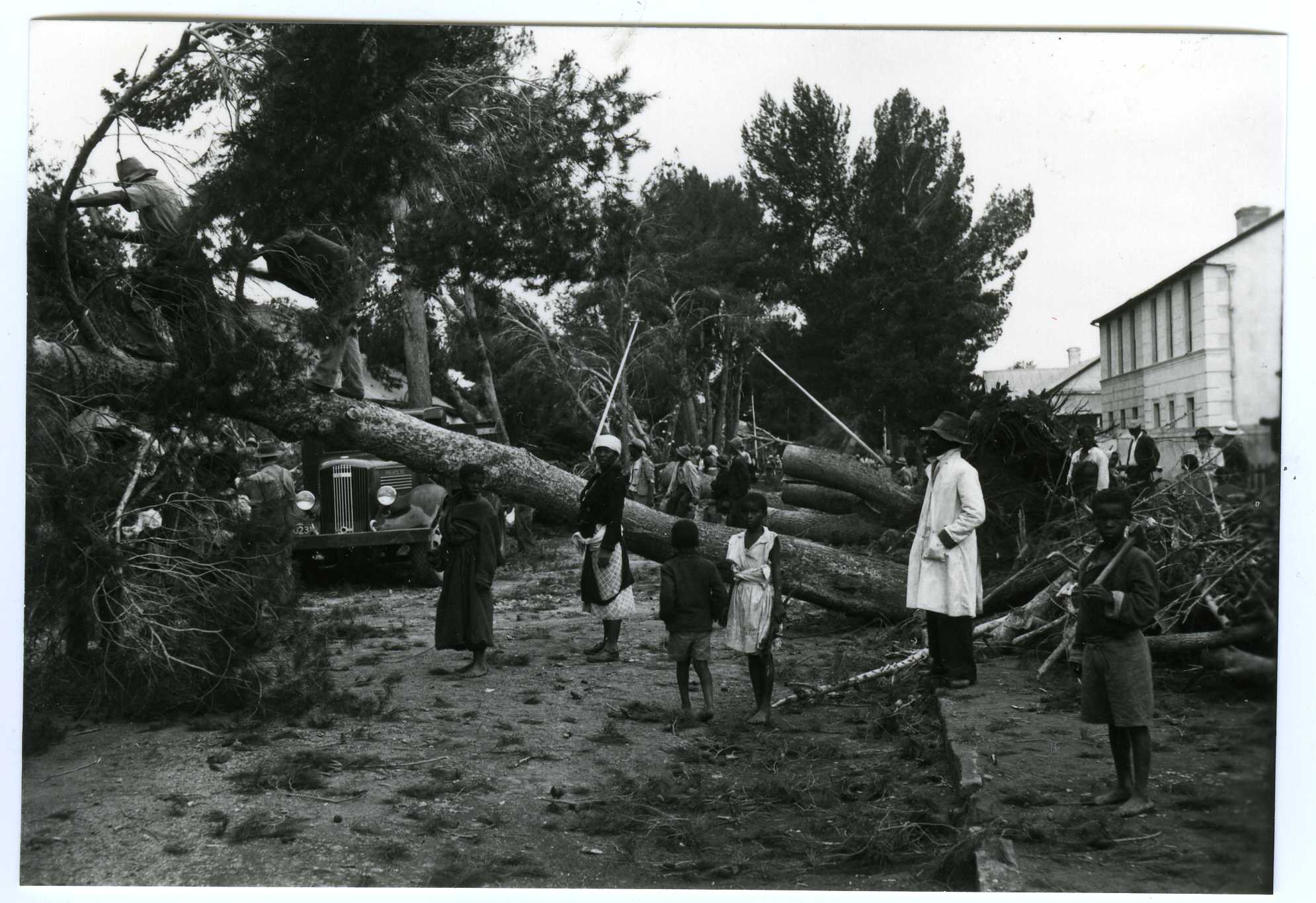 - Glass negative : Fourteen views of storm damage in Bree Street, Cradock, 5 March 1937, showing uprooted trees, buldozers clearing debris, and onlookers surveying the damage.