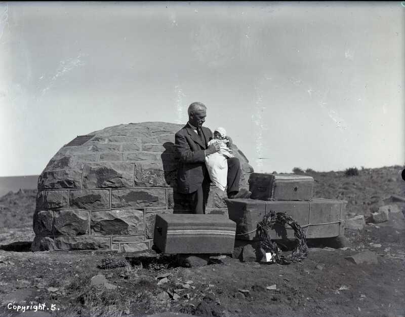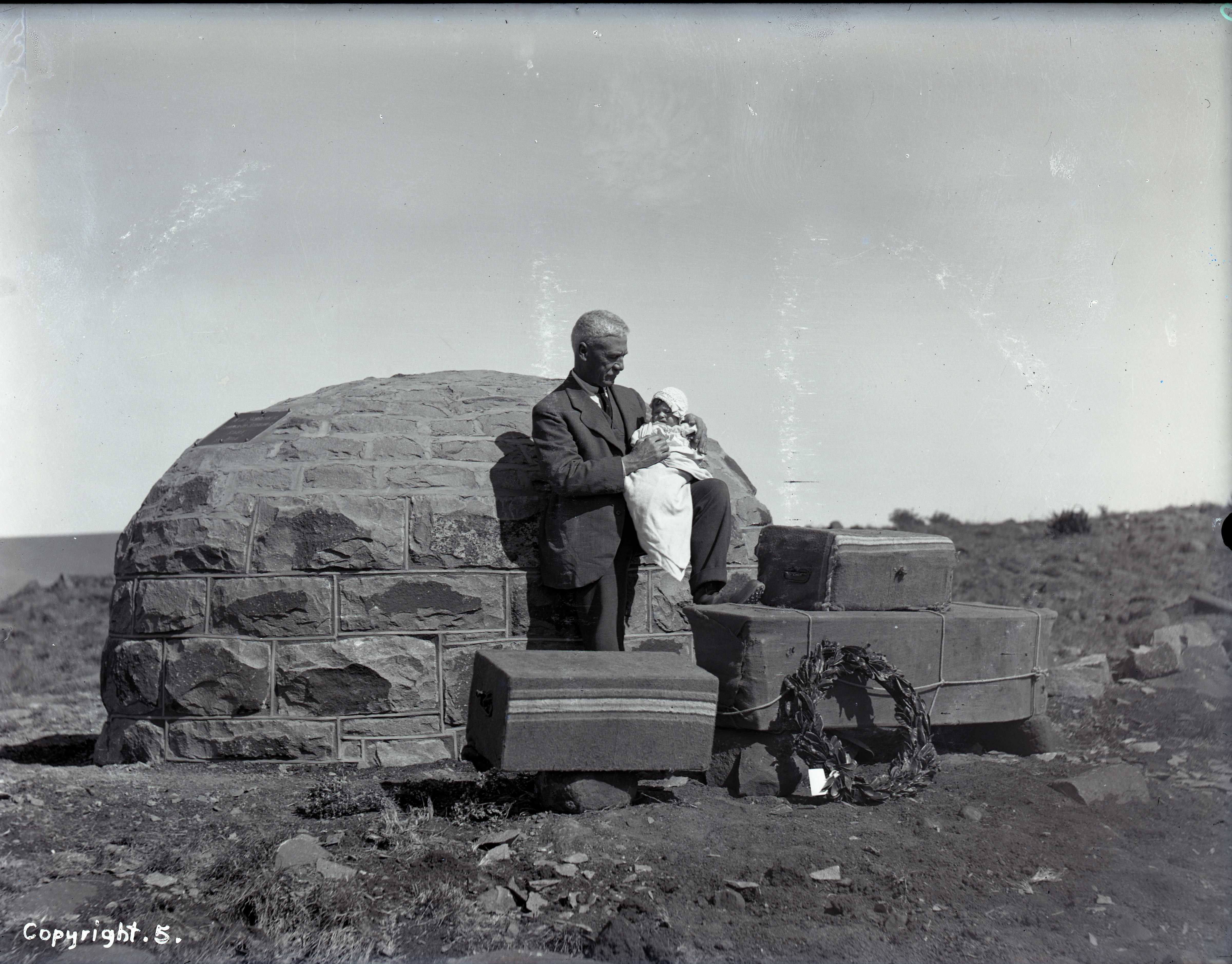 Lidbetter, William Walpole, “Samuel Cronwright-Schreiner holding baby Maria Cronwright van Dijk in front of the sarcophagus on Buffelskop, 13 August 1921”, Cory Library and Historical Archives, accessed 29 December 2025, https://digitalarchives.ru.ac.za/s/cory/item/5633