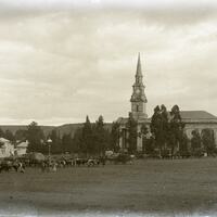 - Glass negative : View of wagons on Market Square, Cradock, 2 April 1904, with the Dutch Reformed Church in the background.